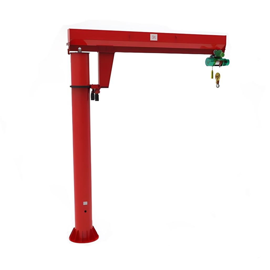 BZD型電動(dòng)全回轉(zhuǎn)懸臂起重機(jī)是與CD1MD1型電動(dòng)葫蘆配套使用的一種起重機(jī),本起重機(jī)由立柱,回轉(zhuǎn)臂回轉(zhuǎn)驅(qū)動(dòng)裝置及電動(dòng)葫蘆組成,立柱下端通過地腳螺栓固定  在混凝土基礎(chǔ)上,由擺線針輪減速裝置來驅(qū)動(dòng)懸臂回轉(zhuǎn),電動(dòng)葫蘆在懸臂工字鋼上作左右直線運(yùn)行,并起吊重物。定柱式旋臂起重機(jī)由立柱裝置、回轉(zhuǎn)裝置、旋臂裝置及環(huán)鏈電動(dòng)葫蘆等組成,主要包括上立柱、下立柱、主梁、主梁拉桿、起升機(jī)構(gòu)(環(huán)鏈電動(dòng)葫蘆)、回轉(zhuǎn)機(jī)構(gòu)、電氣系統(tǒng)、爬梯及檢修平臺(tái)。立柱下端固定于混泥土基礎(chǔ)上,旋臂回轉(zhuǎn),可根據(jù)用戶需求進(jìn)行回轉(zhuǎn)?;剞D(zhuǎn)部分分為手動(dòng)回轉(zhuǎn)和電動(dòng)回轉(zhuǎn)。環(huán)鏈電動(dòng)葫蘆安裝在旋臂軌道上,用于起吊重物